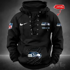 Seattle Seahawks Lace-Up Cross V-Neck Drawstring Hoodie